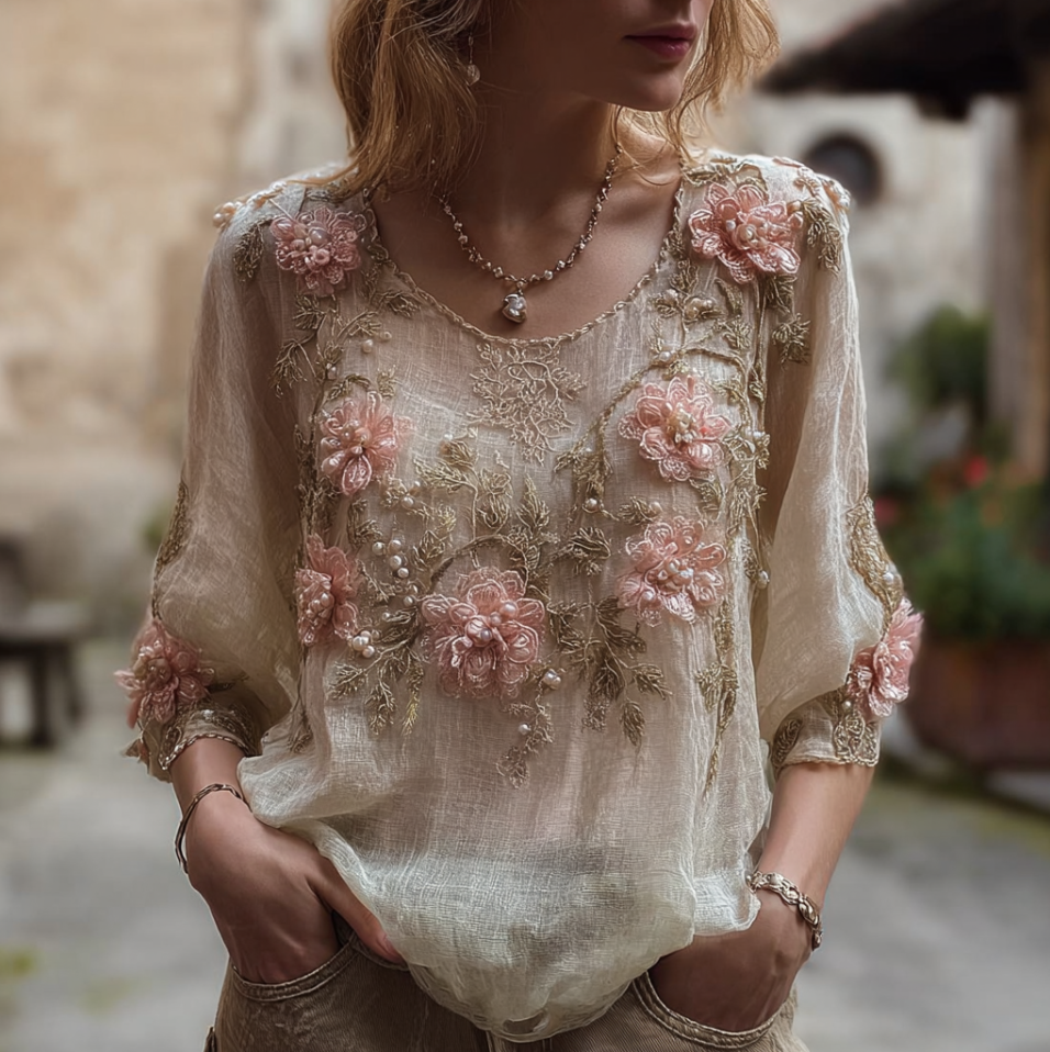 Bohemian Style 3d Pink Flowers And Embroidery Women's Round Neck Cotton And Linen Top