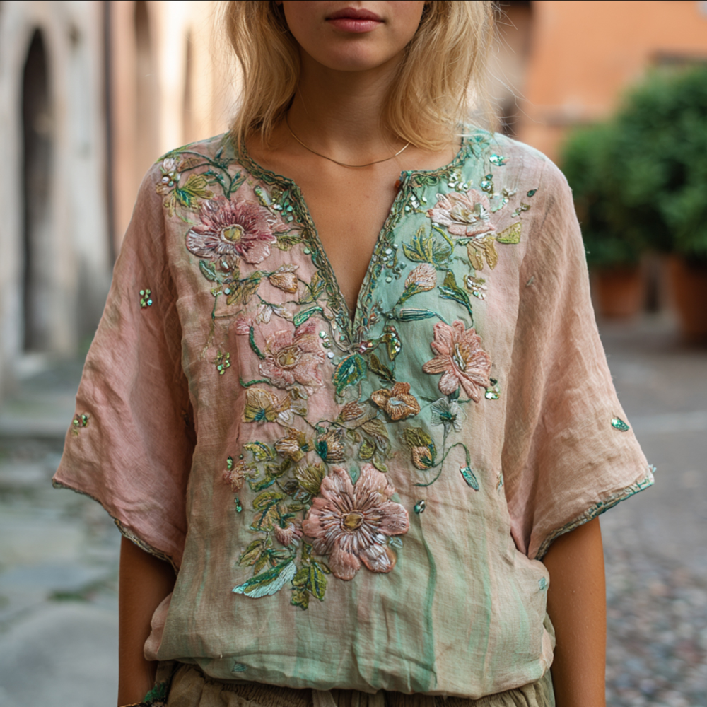 Bohemian Style Pink Flower Sequin Embroidery Vintage Pink-green V-neck Short Sleeve Shirt