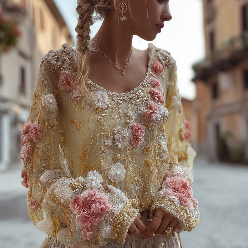 Bohemian Style Plant And Flower Embroidery Women's Round Neck Long Sleeve Cotton And Linen Top