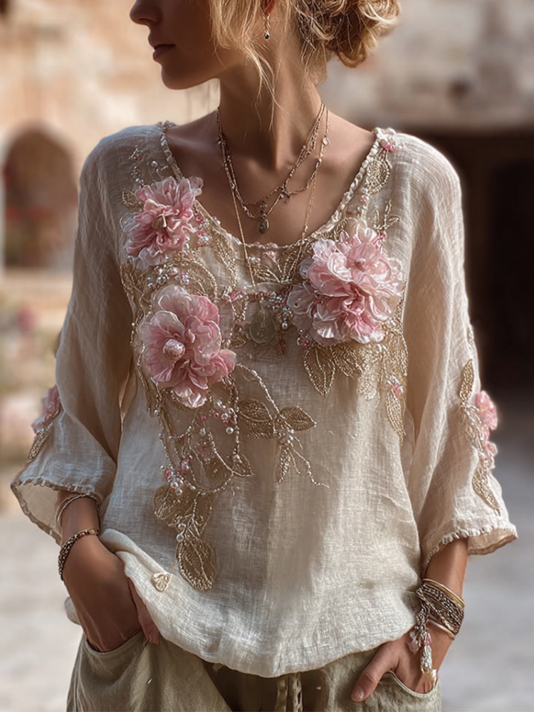 Bohemian Style Round Neck Short Sleeve Three-dimensional Flower Design Women's Thin Top