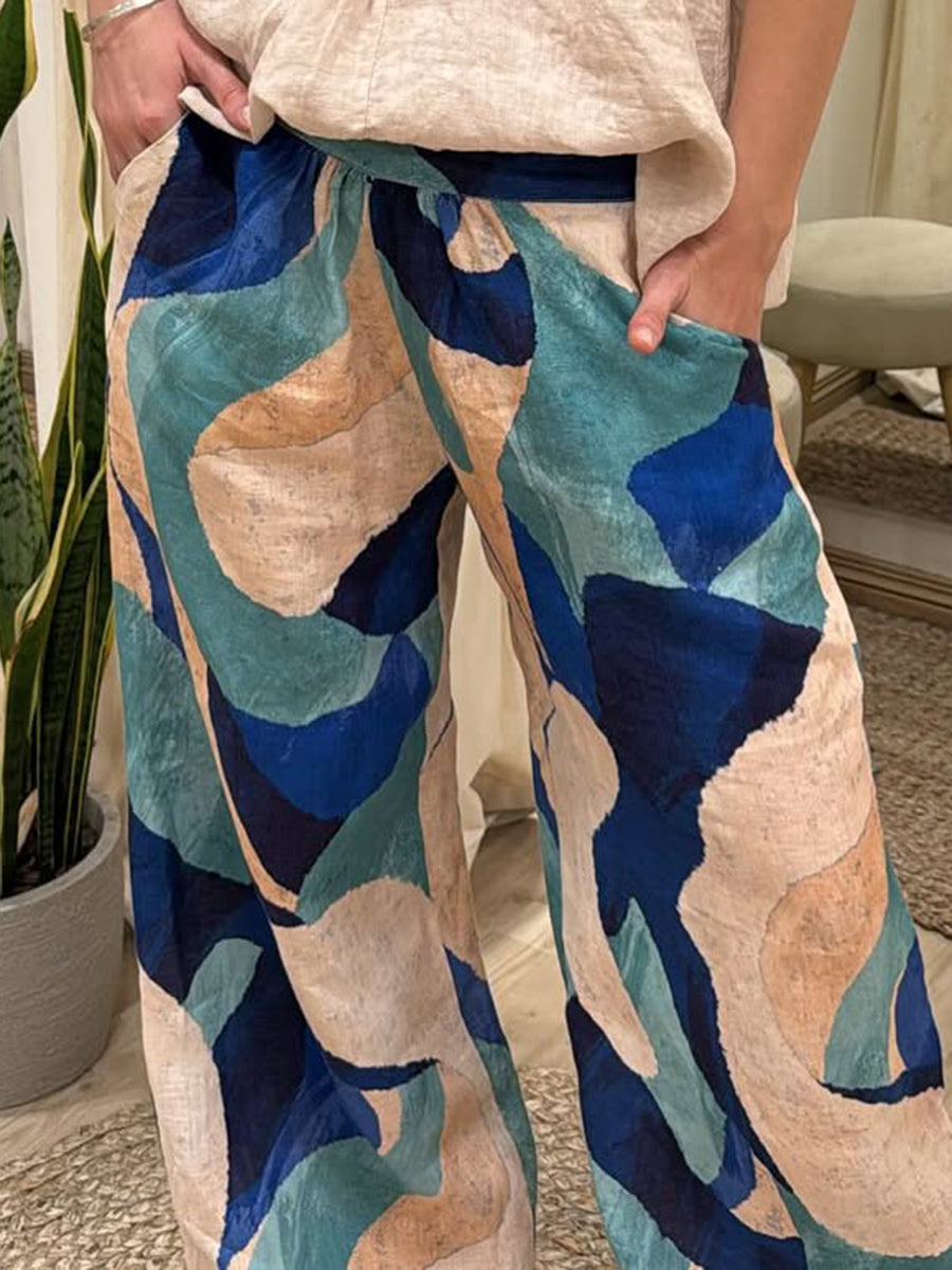 Color Block Print Elastic Waist Linen Trousers