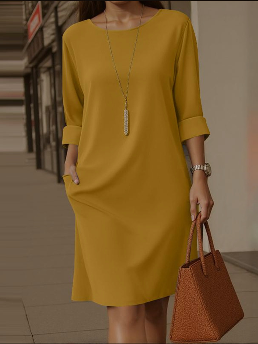 Elegant Round Neck Solid Color Pocket Dress