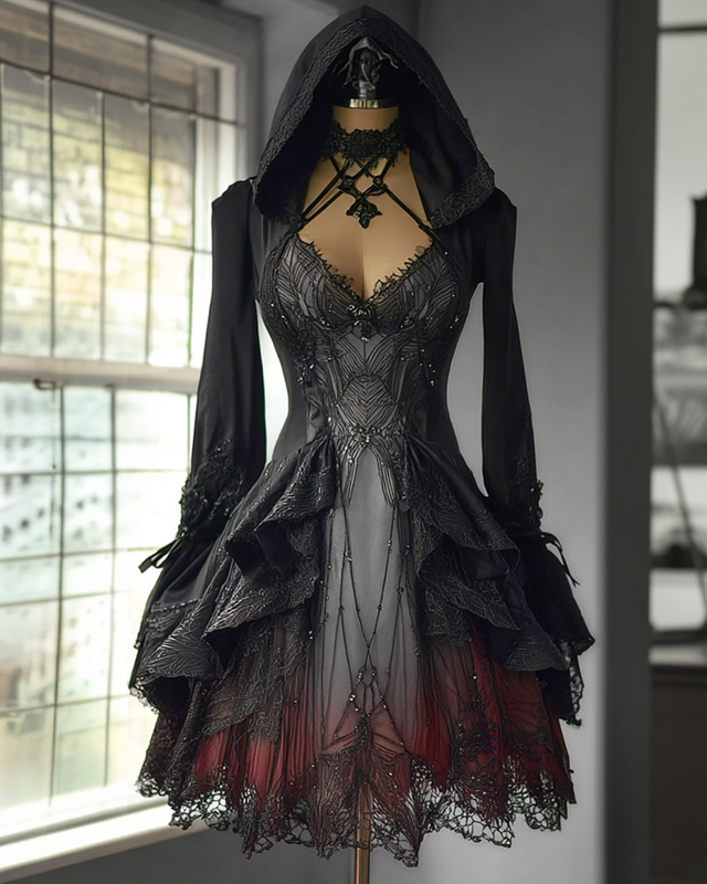Women's Halloween Spiderweb Embroidered Lace Patchwork Hooded Dress 40a5