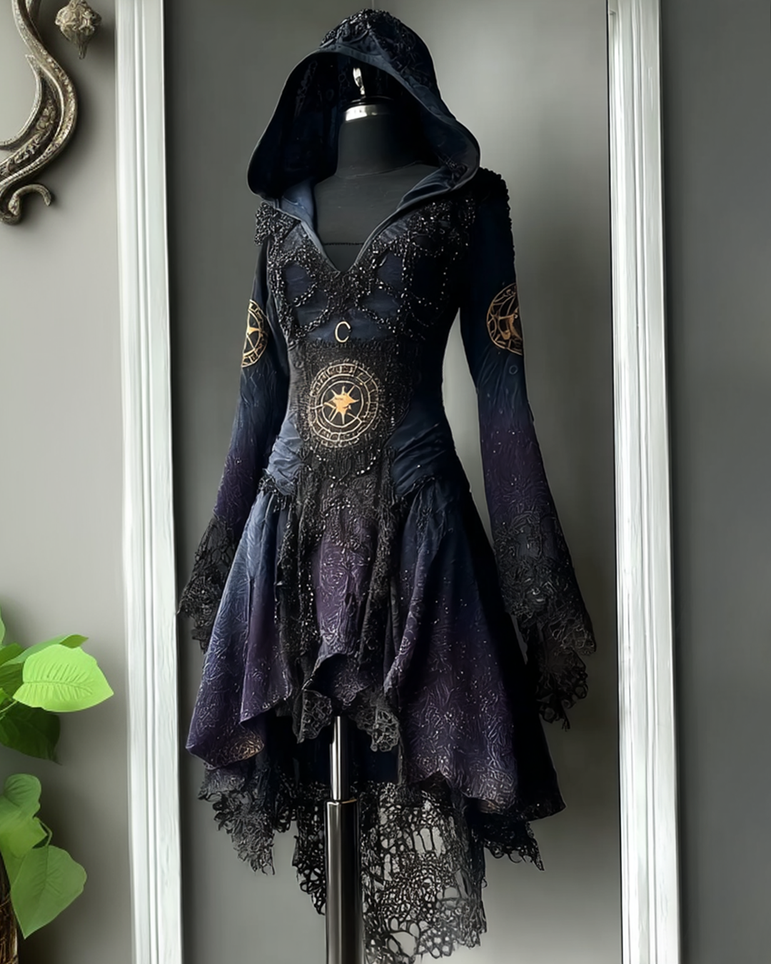 Halloween Gradient Star and Moon Embroidered Lace Patchwork Hooded Dress 8d5c