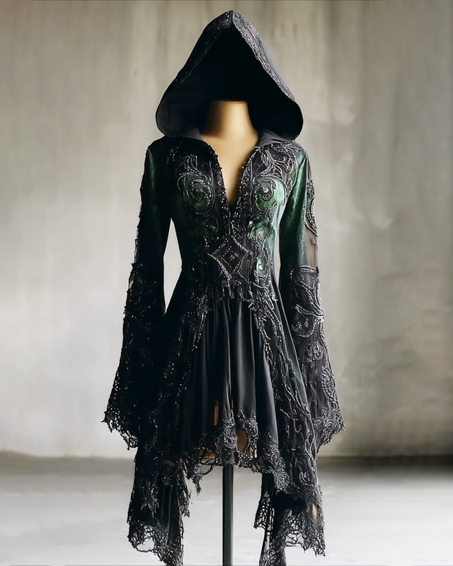 Halloween Gradient Embroidered Lace Patchwork Hooded Dress df61