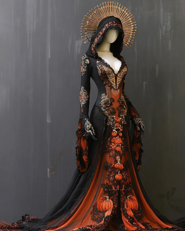 Halloween themed gradient pumpkin embroidered ruffled hooded dress 2dbd