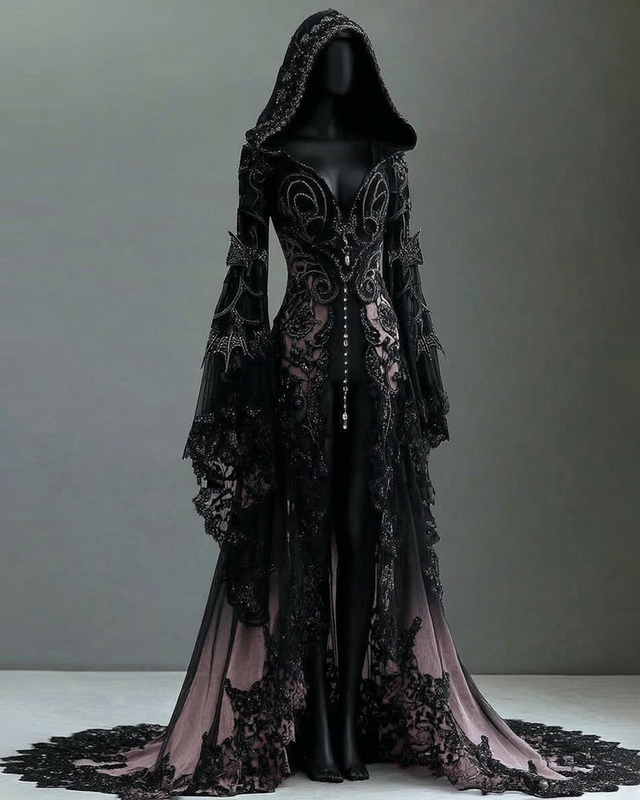 Halloween themed gradient lace embroidery patchwork hooded dress f13f