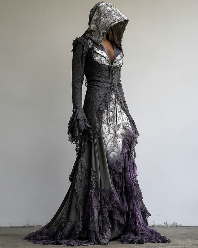 Halloween Themed Irregular Contrast Lace Patchwork Hooded Dress 945d