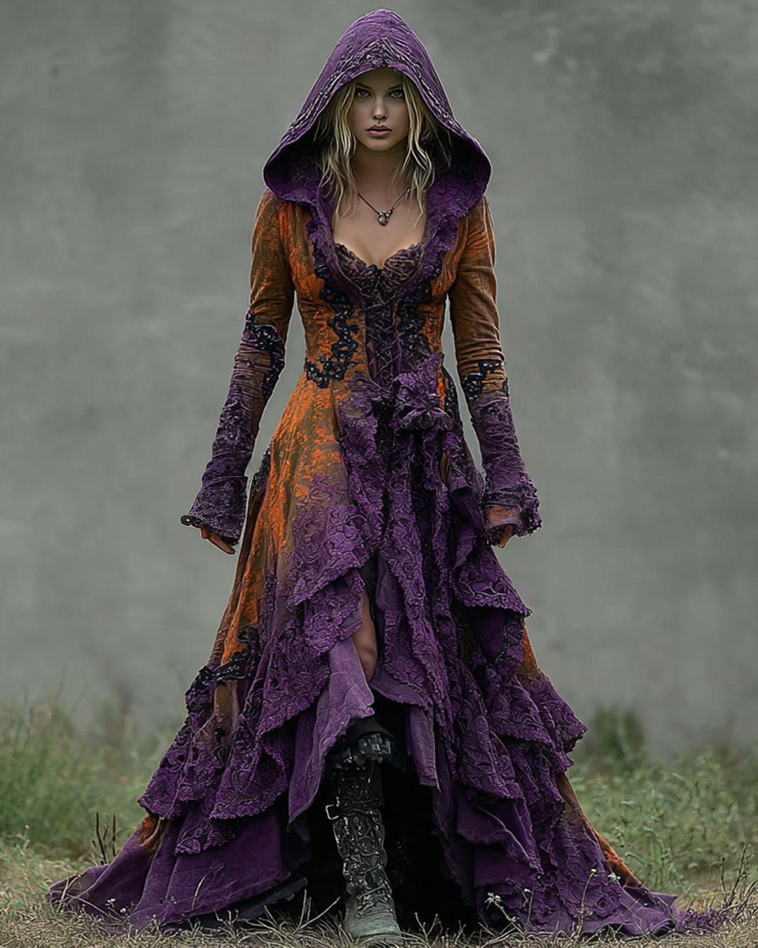 Halloween Themed Irregular Gradient Lace Patchwork Hooded Dress 1634