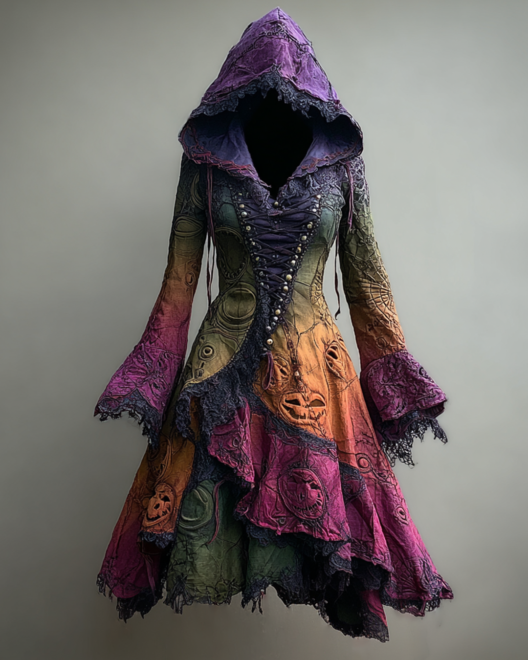 Halloween Themed Irregular Gradient Lace Patchwork Embroidered Hooded Dress 930d