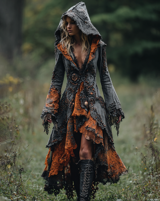 Halloween Themed Irregular Contrast Embroidered Patchwork Hooded Dress cb98