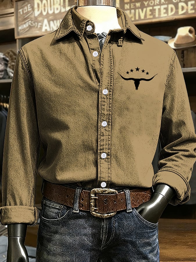Men's Retro Western Cow Head Design Printed Long Sleeve Casual Shirt
