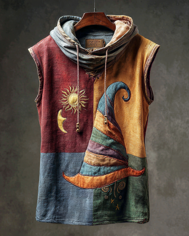 Men's Summer Vacation Star Moon Wizard Hat Embroidery Stitching Hooded Sleeveless Top efc2