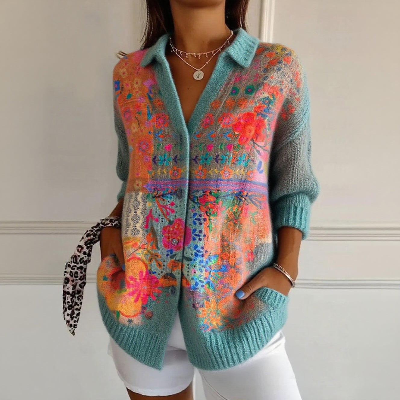 Vintage Flower Art Print Buttoned Cardigan Sweater