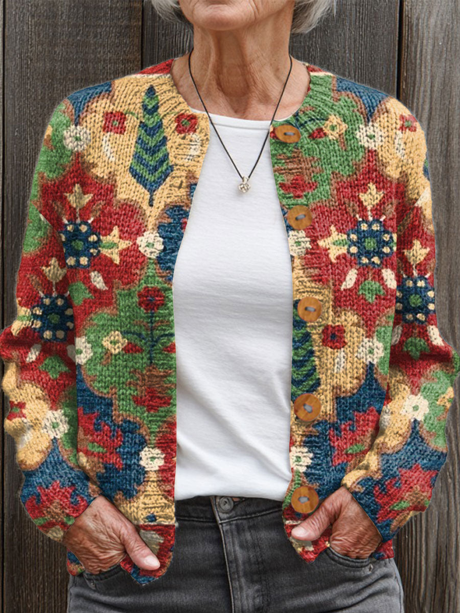 Vintage Flower Art Print Buttoned Cardigan Sweater