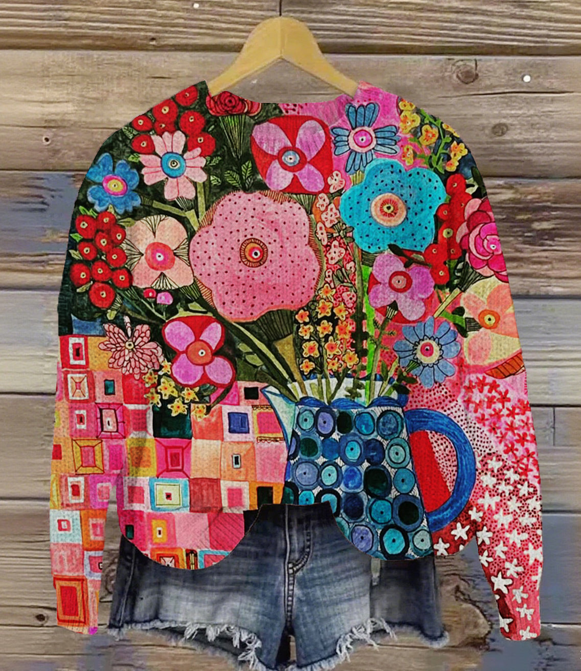 Vintage Lovely Flower Art Print Knit Pullover Sweater