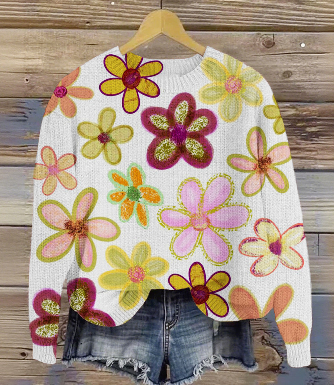 Vintage Lovely Flower Art Print Knit Pullover Sweater