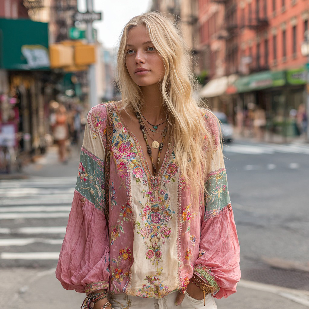 Women's Floral Embroidery Art Boho Colorblock Linen Blend V-neck Shirt