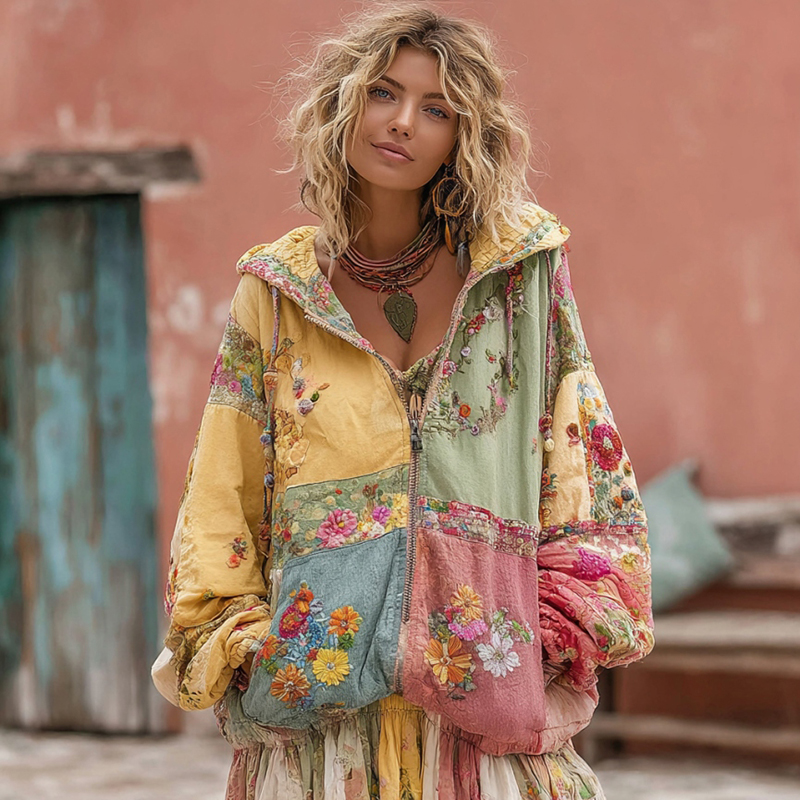 Women's Flower Embroidery Macaroon Color Patchwork Art Casual Zipper Hoodie