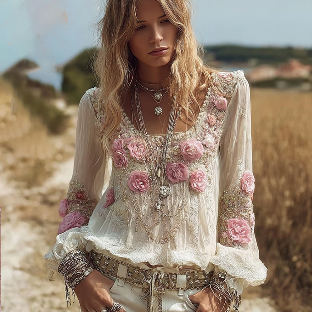 Women's Flower Romantic Pink Vintage Long-sleeved Top