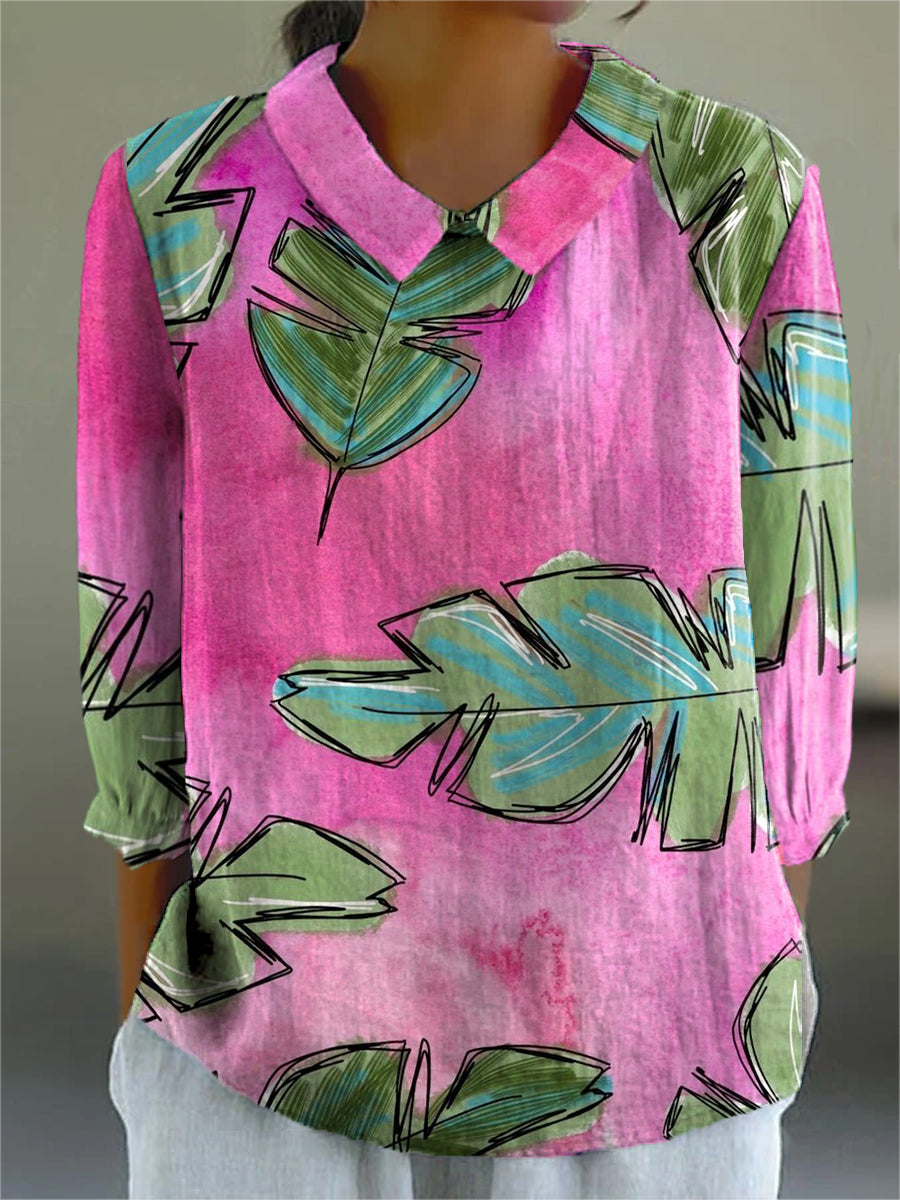 Women's Pink Leaf Pattern Print Casual Cotton And Linen 3/4 Sleeve Shirt