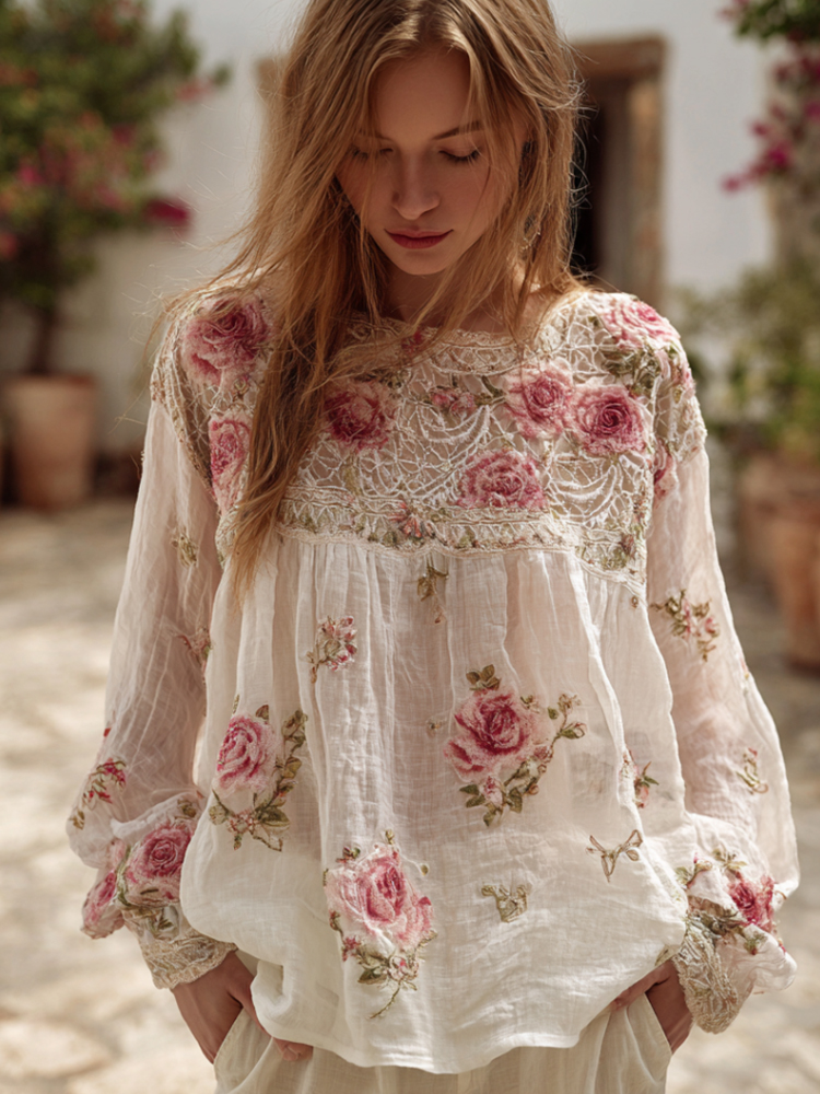Women's Rose Embroidery Vintage Casual Linen Long-sleeved Shirt