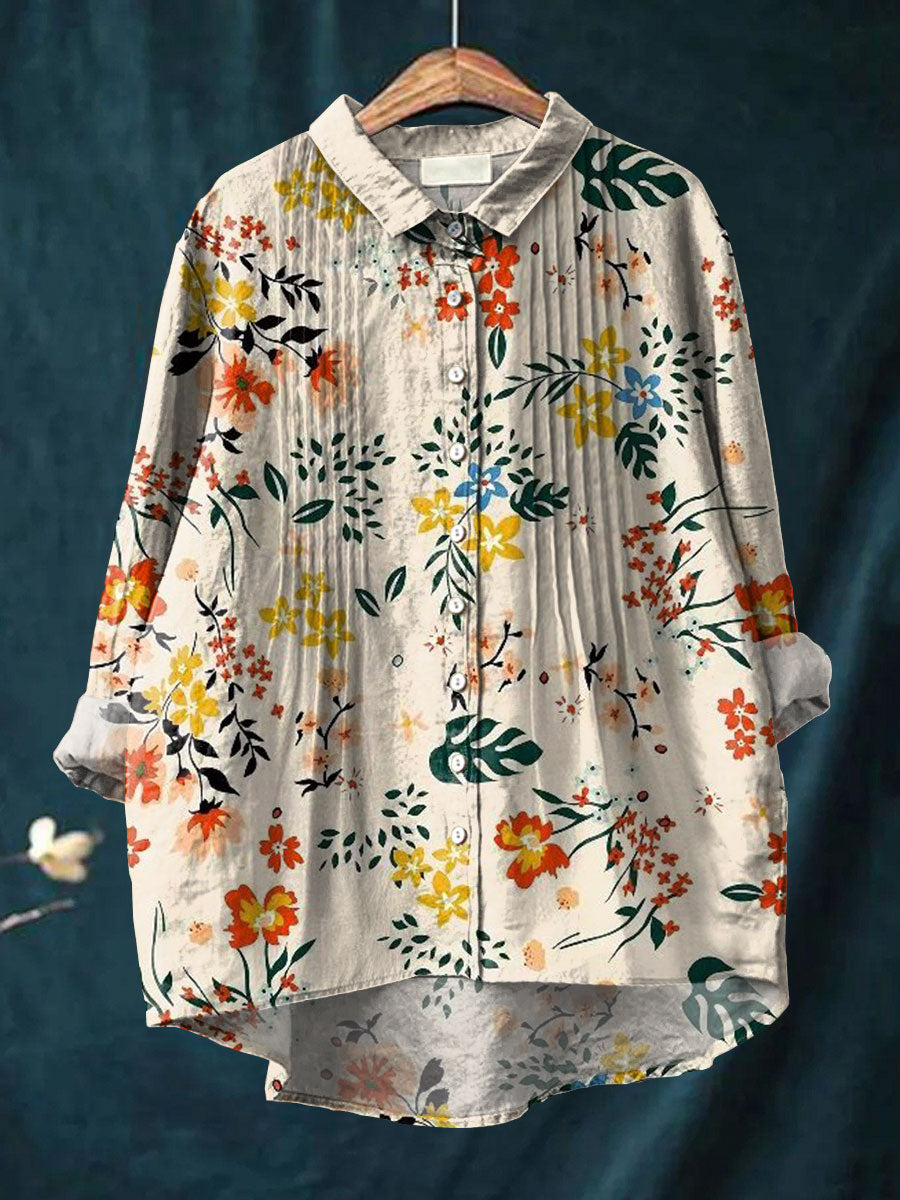 Women's Simple Floral Pattern Art Print Casual Cotton And Linen Ruffle Shirt
