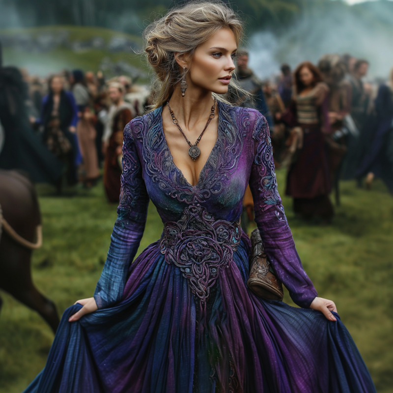 Women's Viking Celtic Knot Art Gradient Comfort Art Linen V Neck Maxi Dress