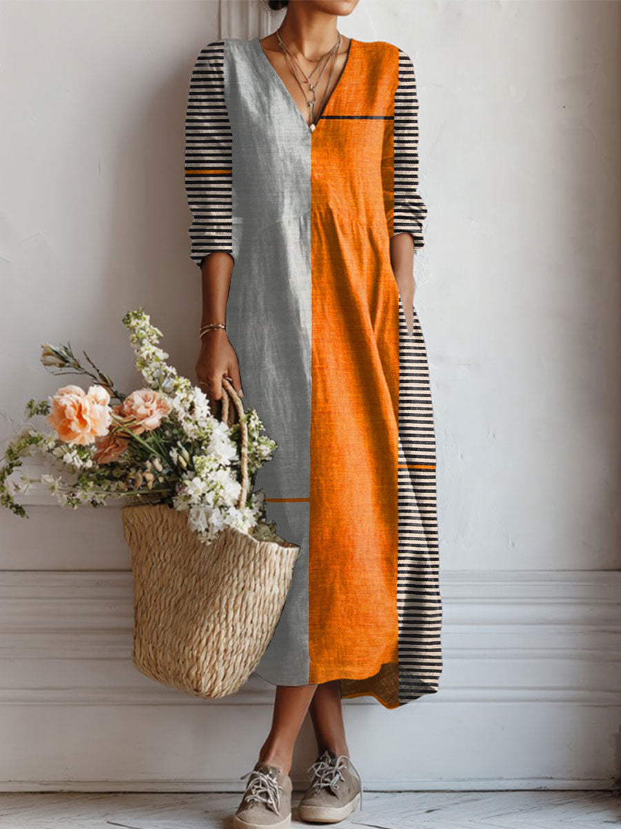 Women's Vintage Abstract Geometry Art Print Linen Pocket Tunic Dress