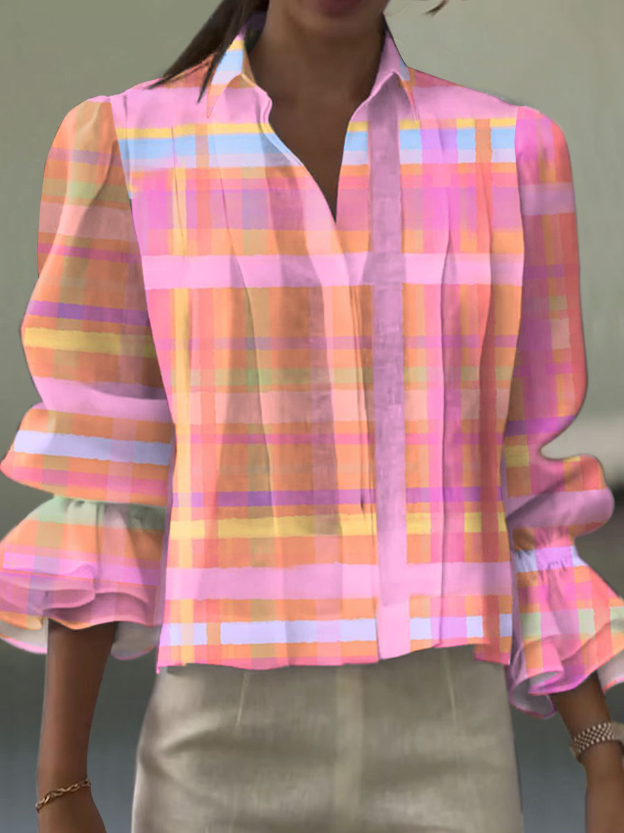 Women's Vintage Abstract Plaid Art Print Casual Cotton And Linen Shirt