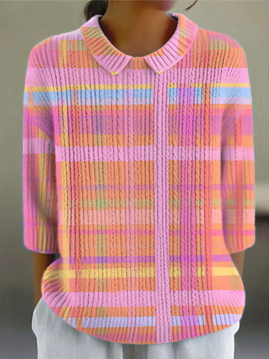 Women's Vintage Abstract Plaid Art Print Casual Peter Pan Collar 3/4 Sleeve Sweater