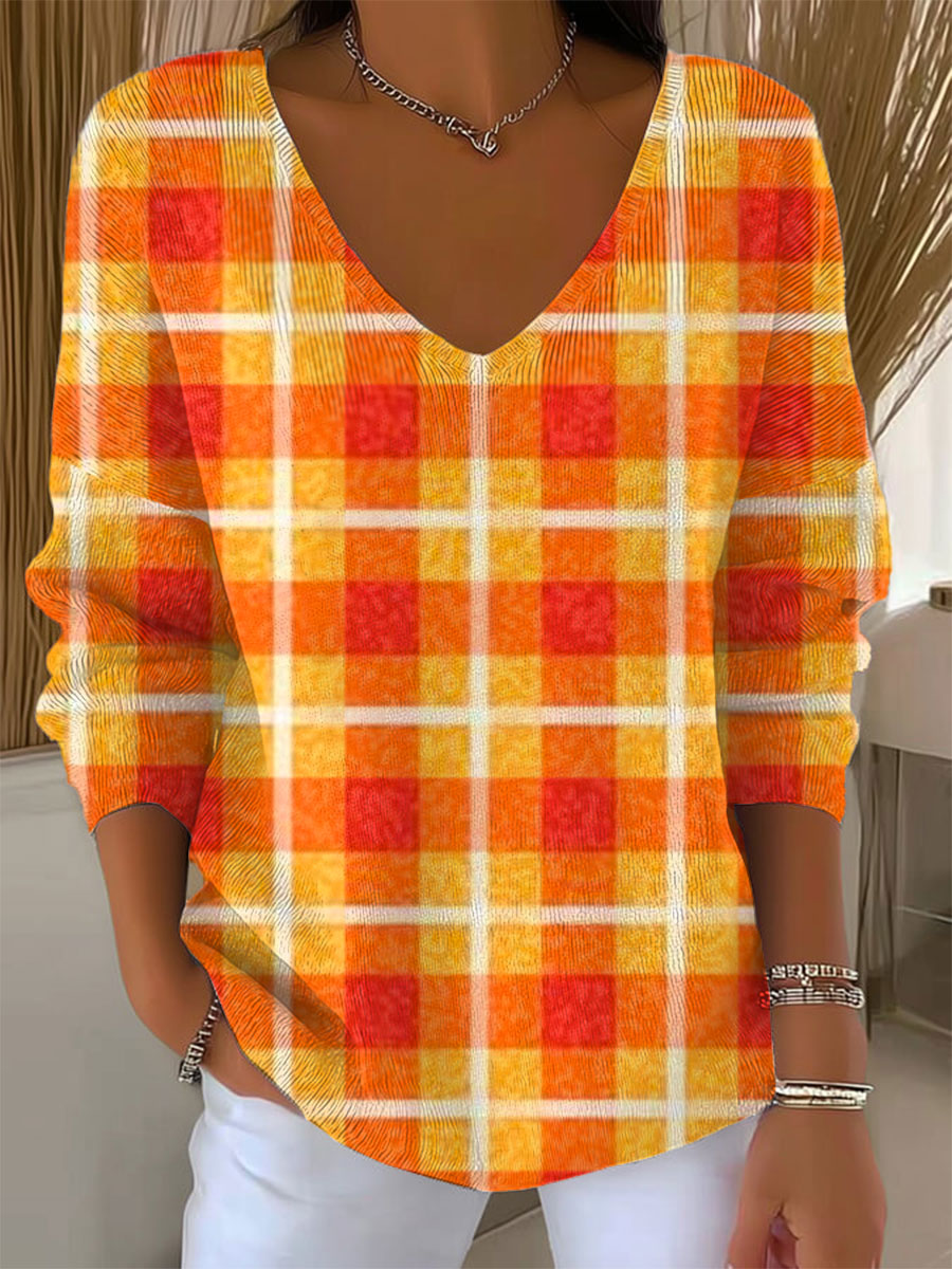 Women's Vintage Abstract Plaid Art Print Casual Pullover Sweater
