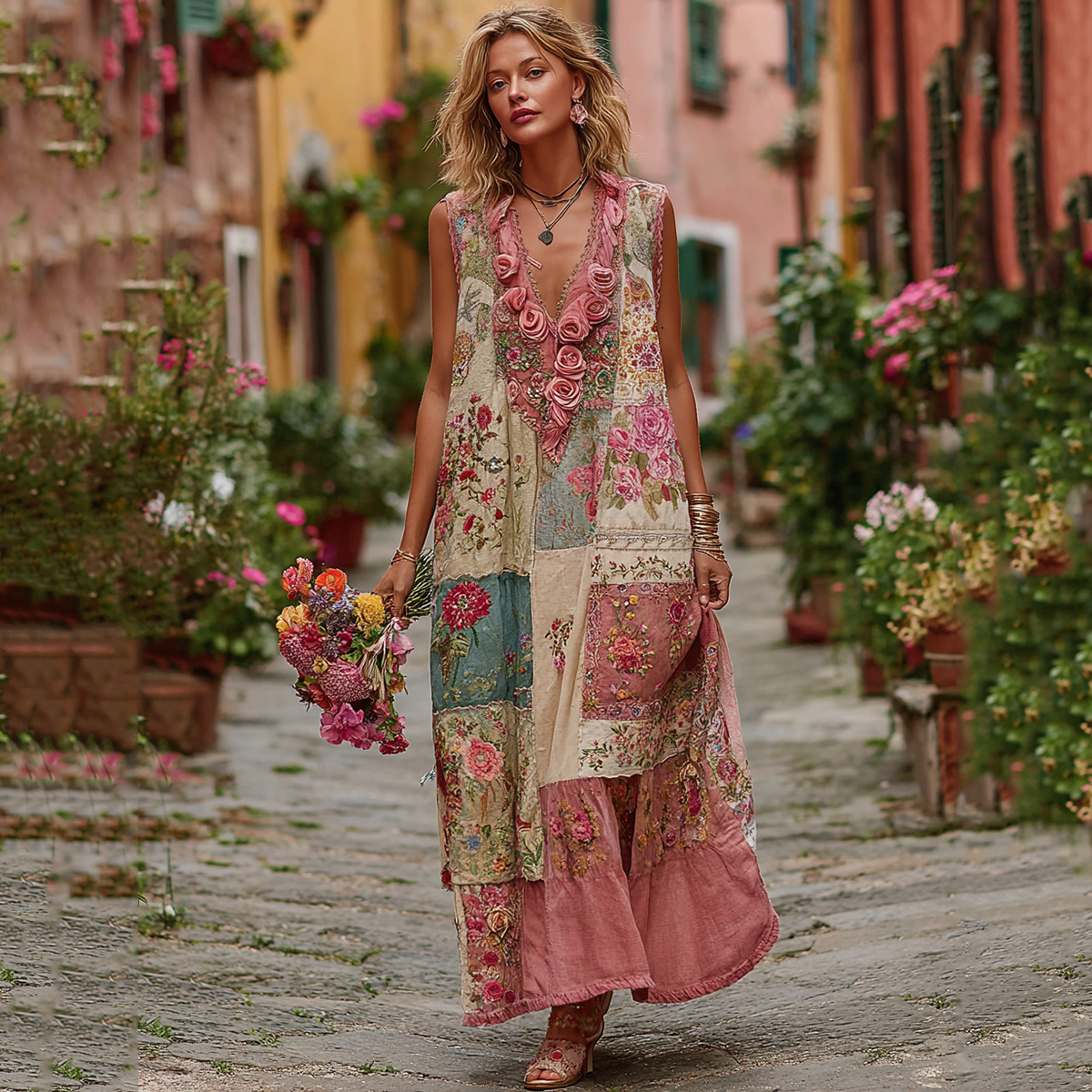 Women's Vintage Bohemian Floral And Rose Patchwork Linen Dress