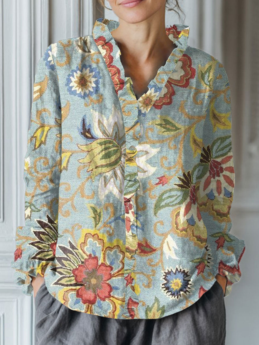 Women's Vintage Flower Art Print Casual Cotton And Linen Ruffle Shirt