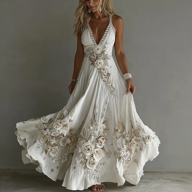 Women's Vintage Flowers Embroidery Art V-neck Suspender Maxi Dress