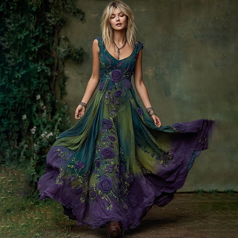 Women's Vintage Purple Floral Art Linen Sleeveless Dress