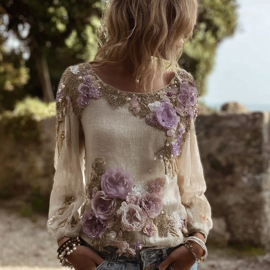 Women's Vintage Purple Flower Embroidery Art Print Round Neck T-shirt