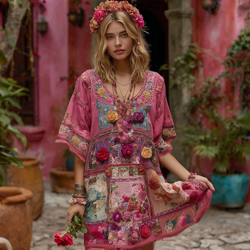 Women's Vintage Rose Floral Embroidery Art Linen Dress