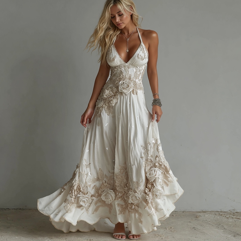 Women's Vintage White Flowers Embroidery Art V-neck Suspender Maxi Dress